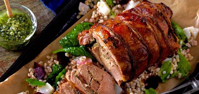 Gni innsiden av lammelåret med myntepesto. Rull kjøttet stramt sammen og bind det opp med en hyssing.