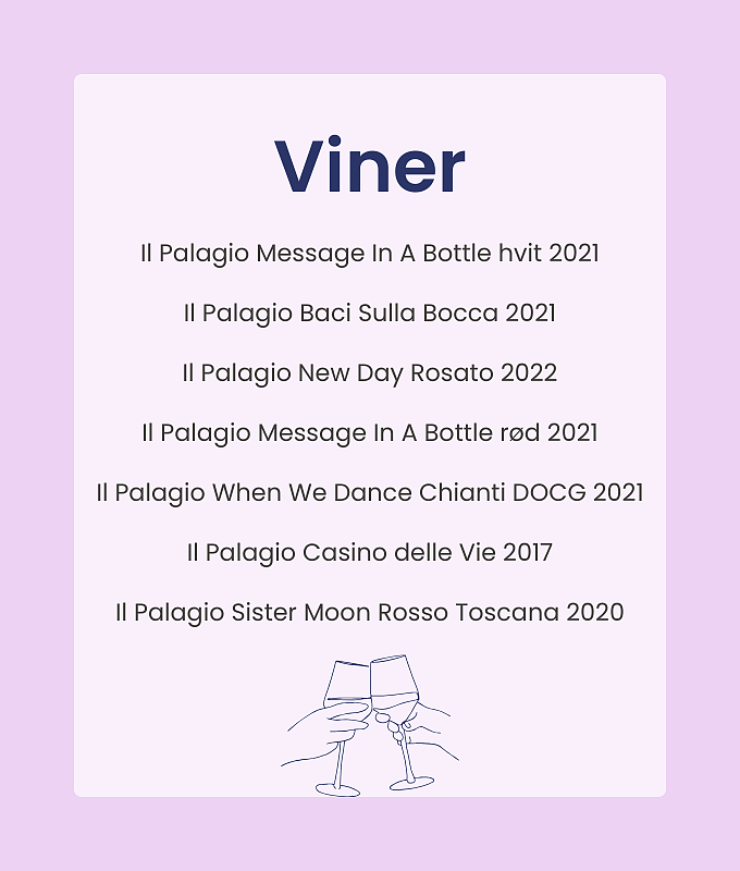 Tony vil dele sin ekspertise om vinene og fortelle deg historien bak Tenuta Il Palagio, noe som gir deg en dypere forståelse av den lidenskapen som er investert i hver flaske. Gå ikke glipp av denne enestående muligheten, ta med deg venner og kjære og bestill i dag..