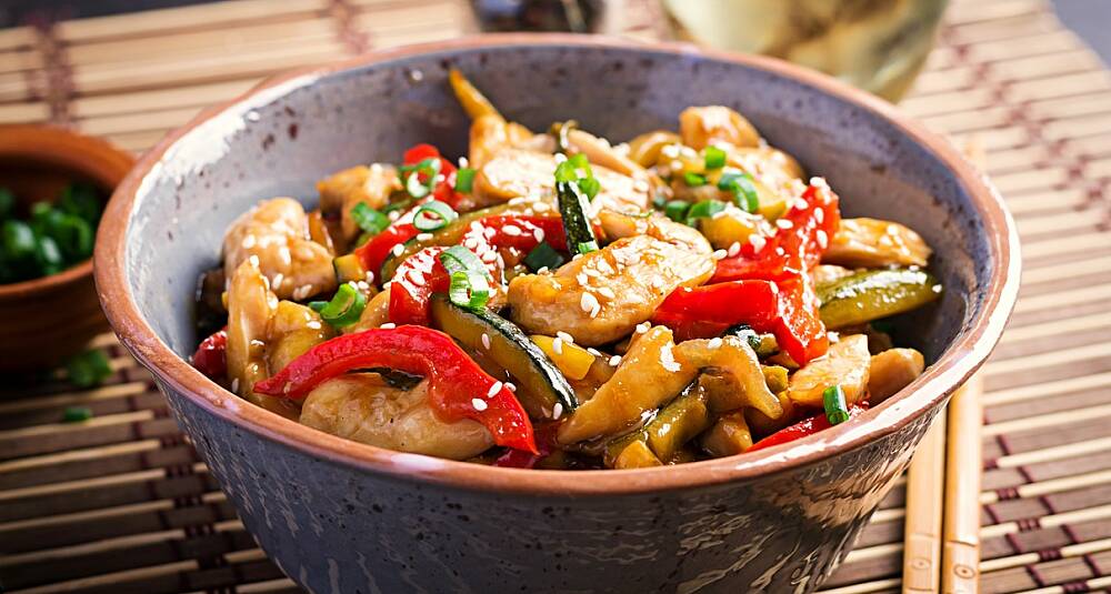 I stedet for kylling kan du fint bruke fisk - eller tofu eller bare sopp om du er i vegetarhumør i dag.