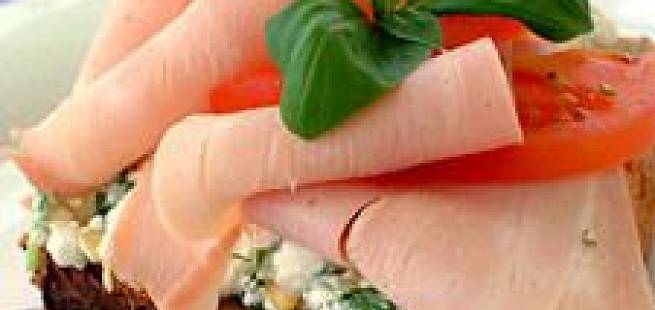- Smør brødskivene med litt smør og legg tynne skiver med stekt kalkunfilet på dem.