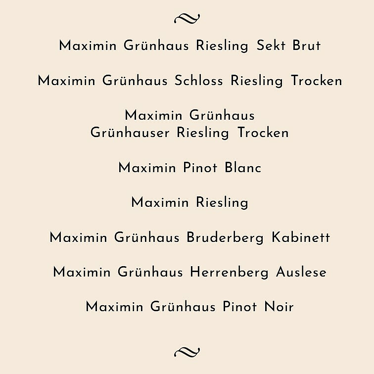 Maximin von Schubert er sjette generasjons vinmaker hos Maximin Grünhaus og kommer selv til Trondheim for å presentere sine viner. Huset kan skilte med noe så unikt som tre monopol toppvinmarker, som vil si at de eier 100 posent av vinmarkene Abstberg, Herrenberg og Brudeberg. Disse vinmarkene gir noen av Moseldalens beste rieslinger og er klasseeksempler på nydelig tysk vin med lang historie.