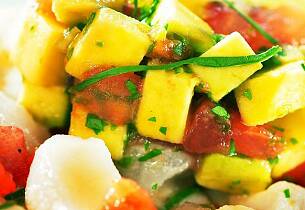 Les hele sakenCeviche er både syrlig og med et lett chilibitt, og det er en av suksessfaktorene bak denne retten. I denne oppskriften får den mer syre, og noe sødme fra appelsinen samt økt metthetsfølelse fra avocadoen.