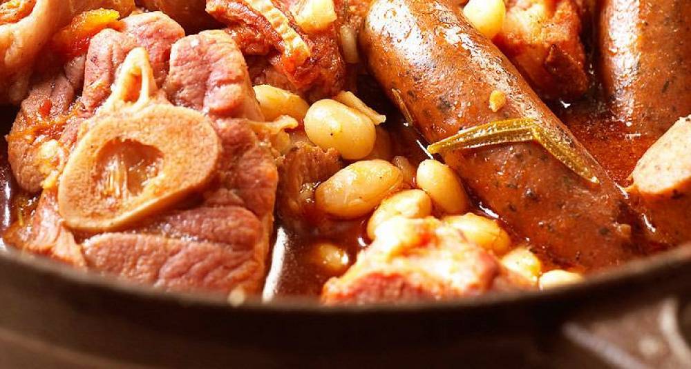 - Forvarm stekeovnen til 200 grader, legg svoren nederst i gryta, fordel lag av bønner og kjøtt, og et lag bønner blandet med oppskåret pølse øverst. Strø på tørkede brødsmuler.