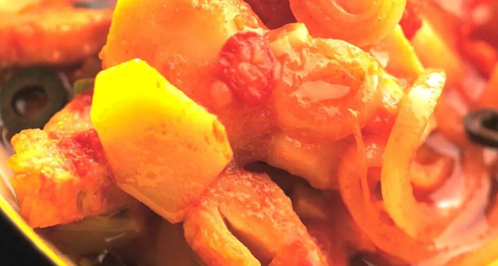 Skrell poteter og skjær de i jevne skiver. Ha potetene i tomatsausen, og la de mørne i ca 10-12 min.