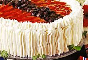 Legg den nederste bunnen på et serveringsfat, stryk på et lag med vaniljekrem, og dekk det med jordbærskiver. Legg på neste bunn, stryk på et lag med pasjonscurd og legg på et lag med jordbærskiver. Legg på den øverste bunnen, og fordel krem over hele kaken. Pynt med jordbær og friske bær.