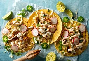 Server med ferdigkokt ris. Topp med biter av avocado, finhakket vårløk, koriander, tortillachips og seterrømme.