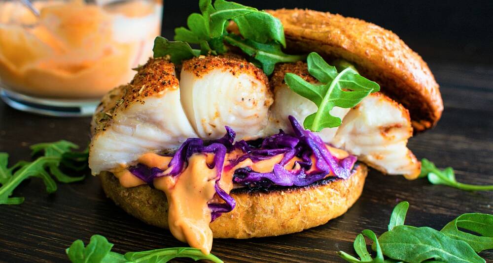 Legg et stykke torsk sammen med salat og tomat mellom to skiver ristet loff eller et burgerbrød.