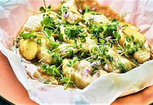 I denne oppskriften får skreien et senvinterlig preg som den kler veldig godt.