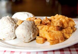 Server med røkt kjøttpølse, rotgrønnsaker, stekt flesk eller spekk og gjerne til fiskesuppe.